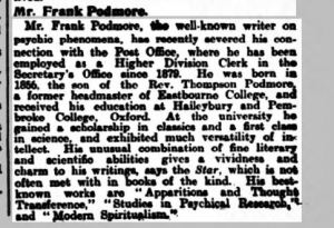The following years were quieter. Frederic Myers died a natural death from Bright’s disease in 1901. Then, on 14th August 1910, Frank Podmore went missing from his home in Malvern.
