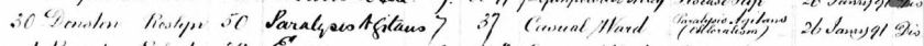 A retired army doctor, custom’s officer and author, Donston’s health and fortunes began to decline during middle age.  On 30th November 1890, he was admitted to Thavies Inn Infirmary aged 50 where his occupation was noted as a journalist.  He was immediately transferred to Bow Road infirmary suffering from paralysis agitans – a Victorian term for Parkinson’s Disease.  Donston was discharged on 26 Jan 1891 and was recorded as a resident of The Triangle Hotel on the 1891 census.  By the time of the 1901 census, he was back in the workhouse infirmary – this time in Islington.  Over the next ten years, he was repeatedly admitted and discharged from Islington Infirmary and was still there at the time of the 1911 census, where he was recorded as a 71-year-old author from Sculcoates, Yorkshire.  His last recorded discharge was from St John’s Road workhouse in Islington where he was sent to the infirmary on 28th September 1916. He died of cancer of the throat on 9th October the same year.